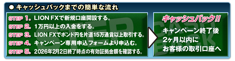 キャッシュバックは、キャンペーン終了後2ヵ月以内にお客様の「LION FX」取引口座へご入金させていただきます。(7)