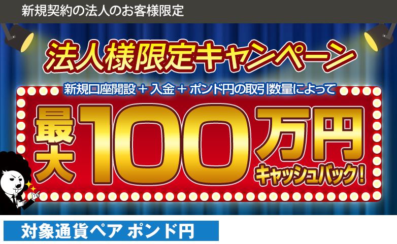 新規口座開設期間内にLION FXにて新規口座開設していただき、取引期間内に1万円以上ご入金され、取引期間内にポンド円の取引数量を満たされた法人のお客様に最大で1,000,000円をプレゼント致します。