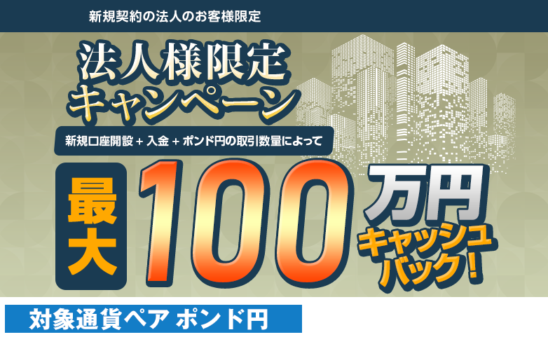 新規口座開設期間内にLION FXにて新規口座開設していただき、取引期間内に1万円以上ご入金され、取引期間内にポンド円の取引数量を満たされた法人のお客様に最大で1,000,000円をプレゼント致します。