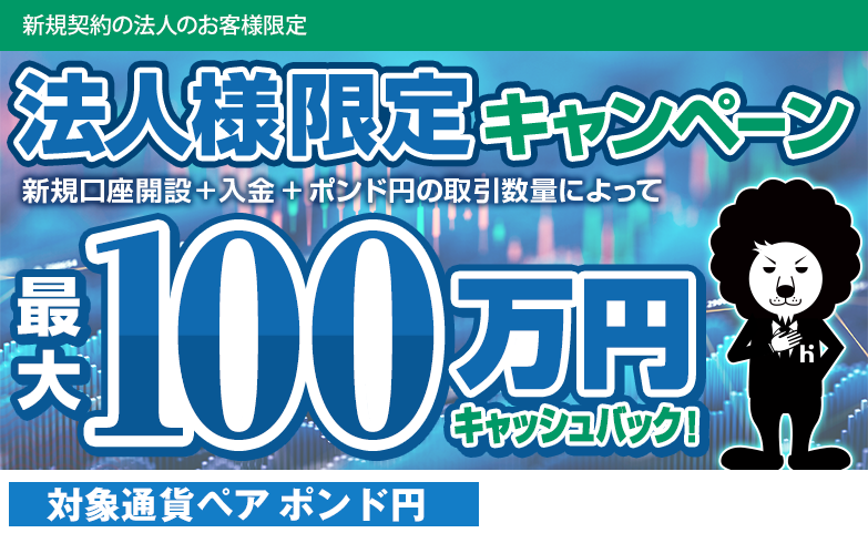 新規口座開設期間内にLION FXにて新規口座開設していただき、取引期間内に1万円以上ご入金され、取引期間内にポンド円の取引数量を満たされた法人のお客様に最大で1,000,000円をプレゼント致します。