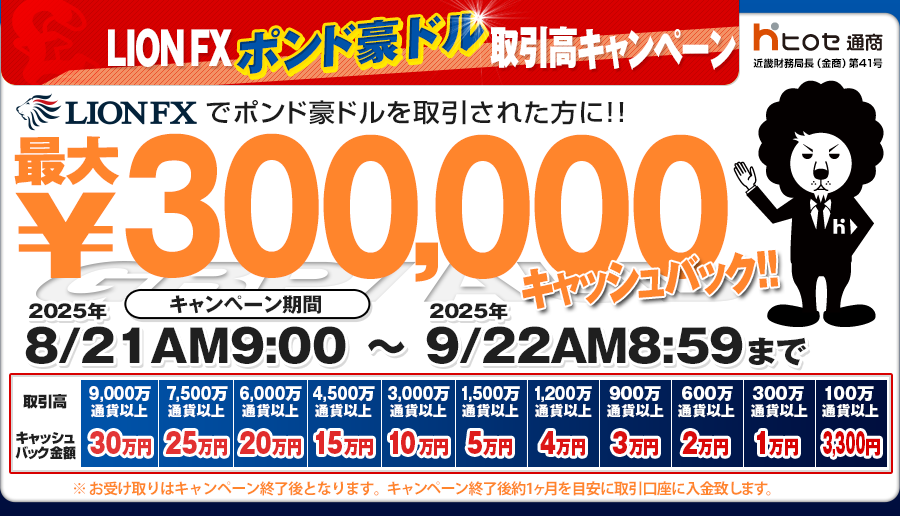 キャンペーン期間中のLION FXでのGBP/AUDの取引高に応じて、最大30万円キャッシュバック致します。