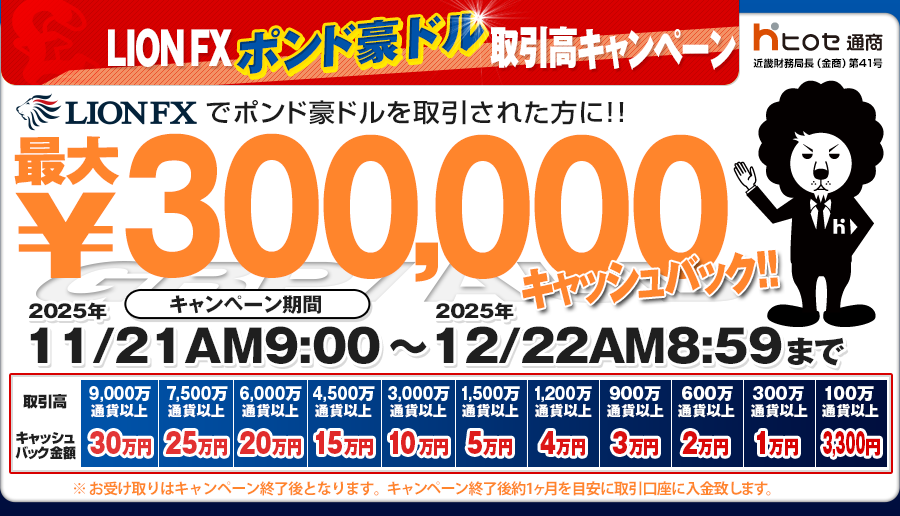 キャンペーン期間中のLION FXでのGBP/AUDの取引高に応じて、最大30万円キャッシュバック致します。