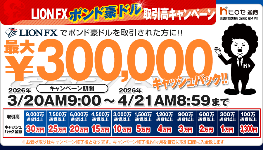 キャンペーン期間中のLION FXでのGBP/AUDの取引高に応じて、最大30万円キャッシュバック致します。