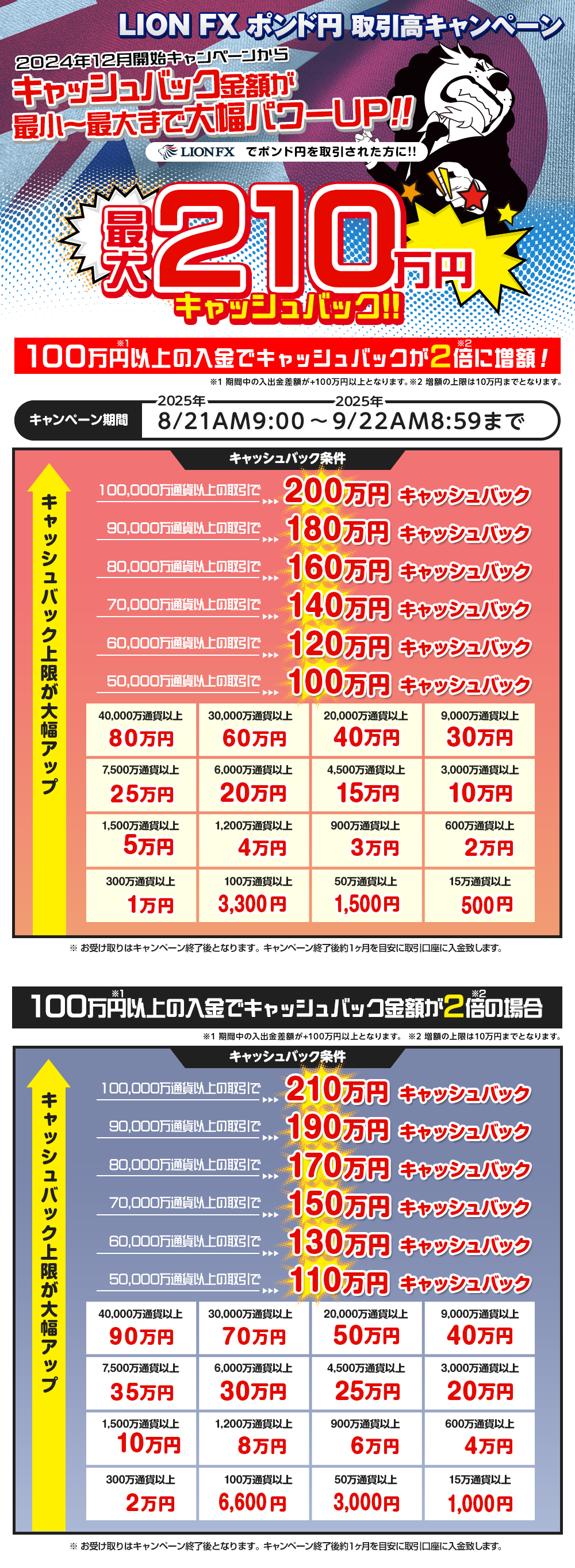 さらに、キャンペーン期間中のLION FXへの入出金差額が+100万円以上の場合、キャッシュバック額を2倍に増額します。