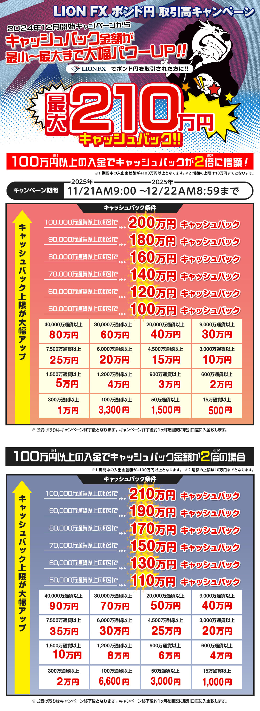 さらに、キャンペーン期間中のLION FXへの入出金差額が+100万円以上の場合、キャッシュバック額を2倍に増額します。