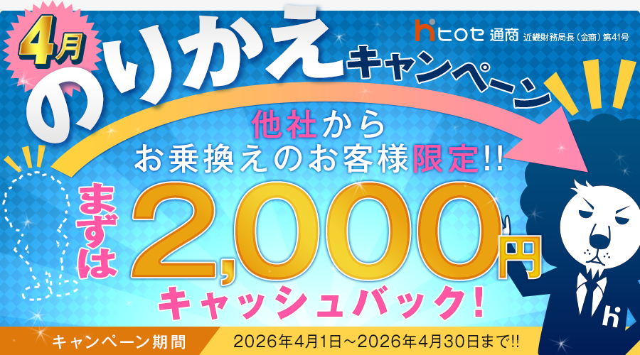 他社でFX取引をされていた方でヒロセ通商にて初めて「LION FX」の口座を開設され、取引期間内に対象通貨ペアを片道10万通貨以上取引された方に2,000円をキャッシュバックいたします。