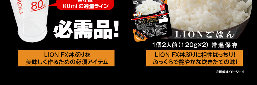 LION FX 親子丼の具(2人前)+LION FX 牛とじ丼の具(2人前)+LION FX 中華丼の具(1人前)+LION FX 麻婆なす丼の具(1人前)+LIONごはん(6人前)+LION FX 計量カップ(1個)をプレゼント!