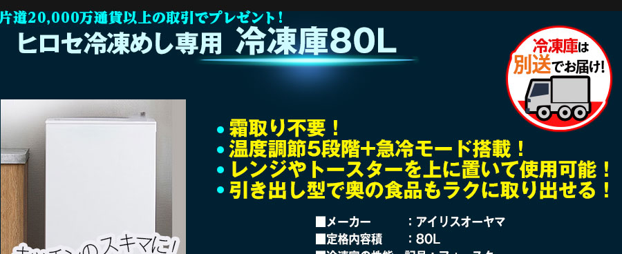 | 家電、冷凍商品、常温商品はそれぞれ別送となります。 商品の到着日が前後する可能性がありますので、あらかじめご了承ください。 ヒロセ冷凍めし専用冷凍庫 ホワイト⁄80Lは、在庫状況によって発送が大幅に遅れる場合がございます。
