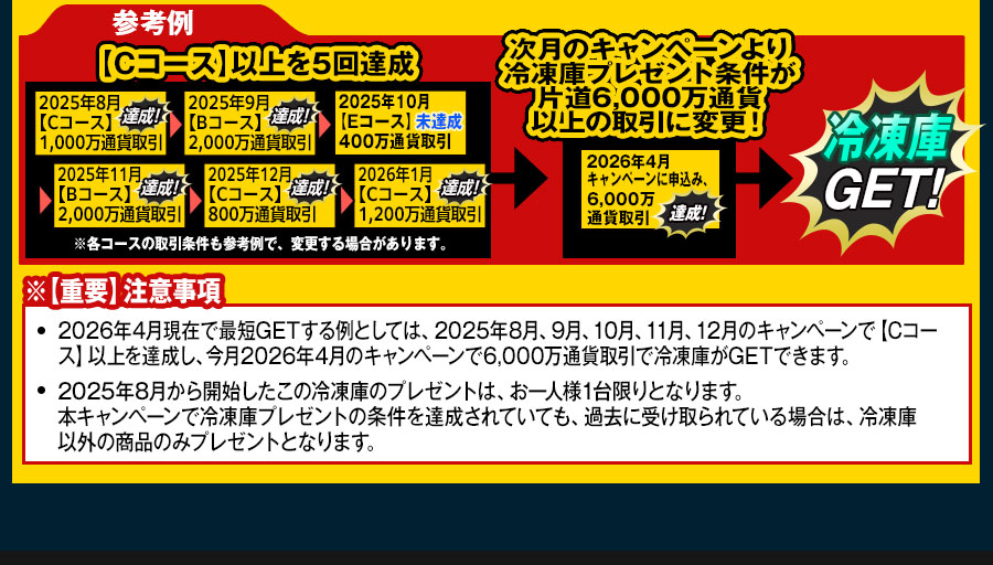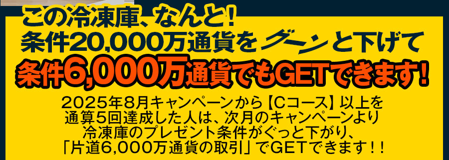 【Aコース】 片道20,000万通貨以上の取引で 【Bコース】 片道2,000万通貨以上の取引で 【Cコース】 片道800万通貨以上の取引で 【Dコース】 片道600万通貨以上の取引で 【Eコース】 片道400万通貨以上の取引で 【Fコース】 片道200万通貨以上の取引で 【Gコース】 片道100万通貨以上の取引で 【Hコース】 片道50万通貨以上の取引で 【Iコース】 片道10万通貨以上の取引で ※ヒロセ冷凍めし専用冷凍庫 ホワイト⁄80L (1台)のプレゼント条件は、2パターンございます。