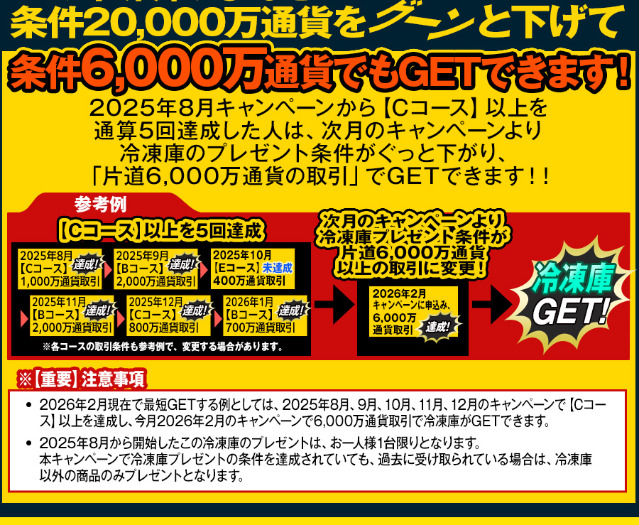 【Aコース】 片道20,000万通貨以上の取引で 【Bコース】 片道2,000万通貨以上の取引で 【Cコース】 片道1,000万通貨以上の取引で 【Dコース】 片道600万通貨以上の取引で 【Eコース】 片道400万通貨以上の取引で 【Fコース】 片道200万通貨以上の取引で 【Gコース】 片道100万通貨以上の取引で 【Hコース】 片道50万通貨以上の取引で 【Iコース】 片道10万通貨以上の取引で