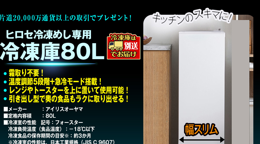 | 家電、冷凍商品、常温商品はそれぞれ別送となります。 商品の到着日が前後する可能性がありますので、あらかじめご了承ください。 ヒロセ冷凍めし専用冷凍庫 ホワイト⁄80Lは、在庫状況によって発送が大幅に遅れる場合がございます。 ※2025年8月から開始した冷凍庫のプレゼントは、お一人様1台限りとなります。本キャンペーンで冷凍庫プレゼントの条件を達成されていても、過去に受け取られている場合は、冷凍庫以外の商品のみプレゼントとなります。