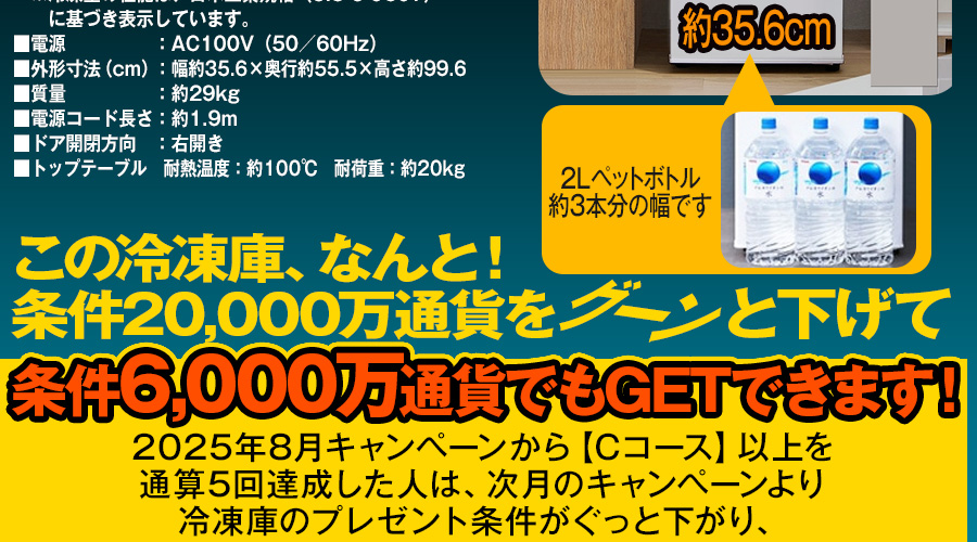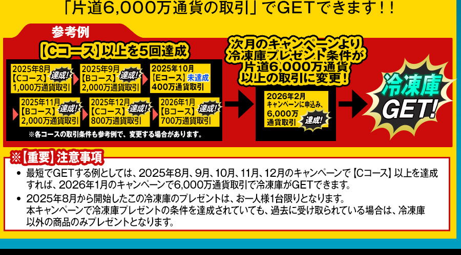 【Aコース】 片道20,000万通貨以上の取引で 【Bコース】 片道1,800万通貨以上の取引で 【Cコース】 片道1,000万通貨以上の取引で 【Dコース】 片道800万通貨以上の取引で 【Eコース】 片道600万通貨以上の取引で 【Fコース】 片道400万通貨以上の取引で 【Gコース】 片道200万通貨以上の取引で 【Hコース】 片道100万通貨以上の取引で 【Iコース】 片道50万通貨以上の取引で 【Jコース】 片道10万通貨以上の取引で ※ヒロセ冷凍めし専用冷凍庫 ホワイト⁄80L (1台)のプレゼント条件は、2パターンございます。