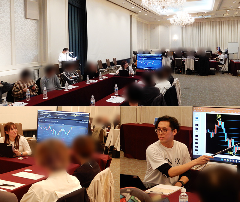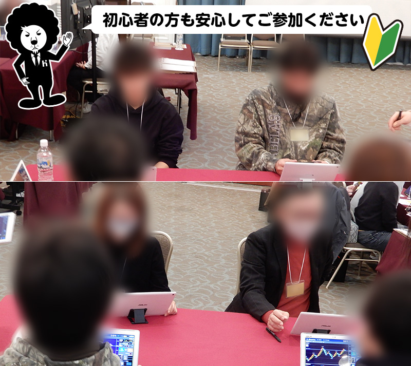 反省会ではテーブルごとに分かれて専属のスタッフがお客様の悩みを事前に伺い、取引画面を見ながらわかりやすく解説します!分からないことや疑問に思ったこともすぐに聞ける環境となっております♪
