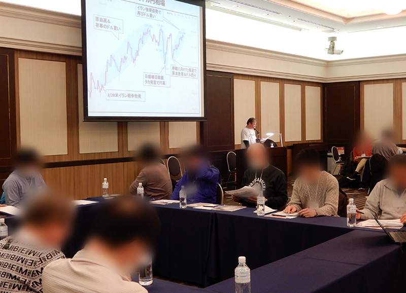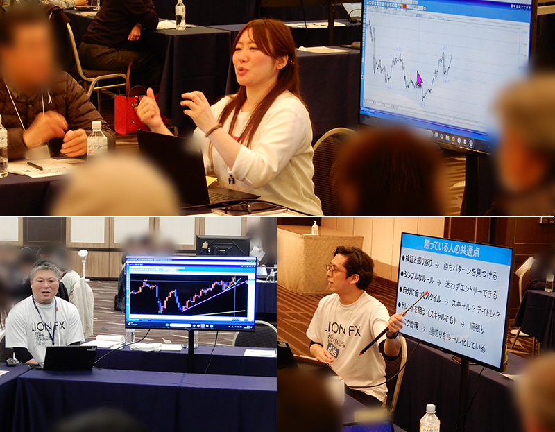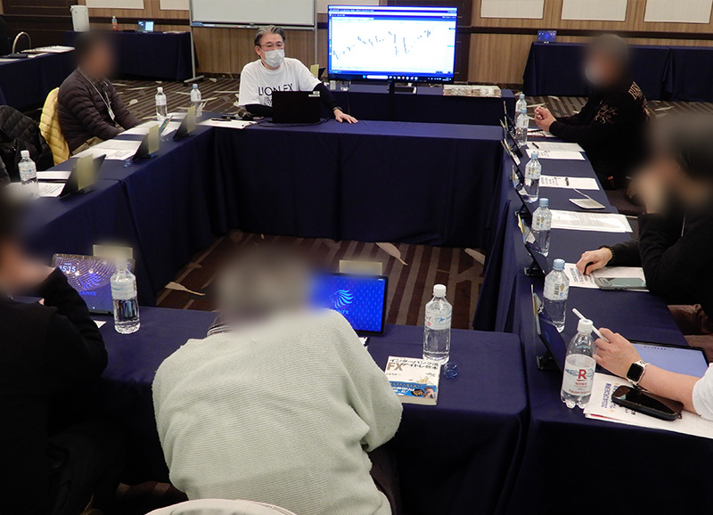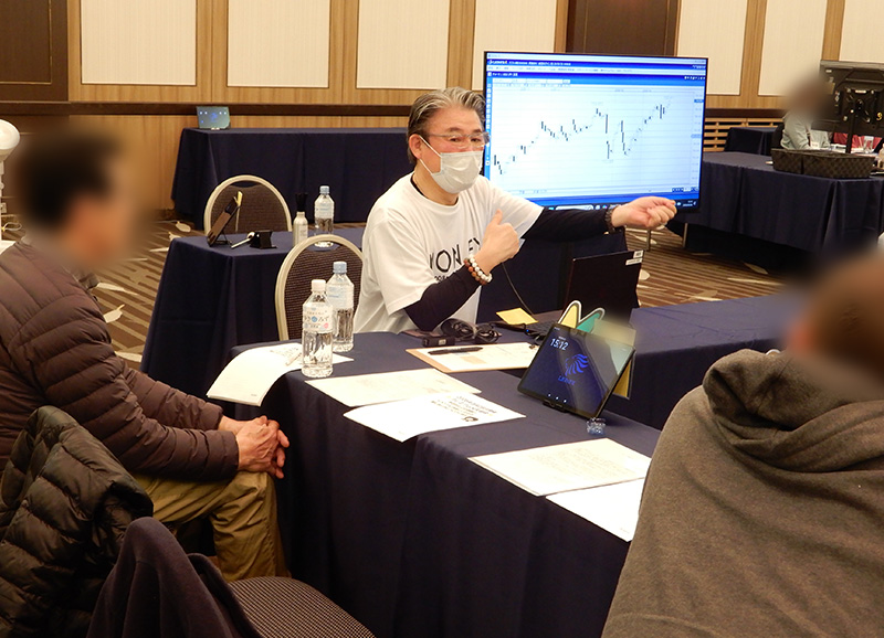 反省会では経験豊富な専門スタッフが各テーブルに分かれ、実際のチャートを見ながら「勝つためのポイント」を丁寧に解説します。 特に「勝っている人の共通点」の話には皆様注目されていました。